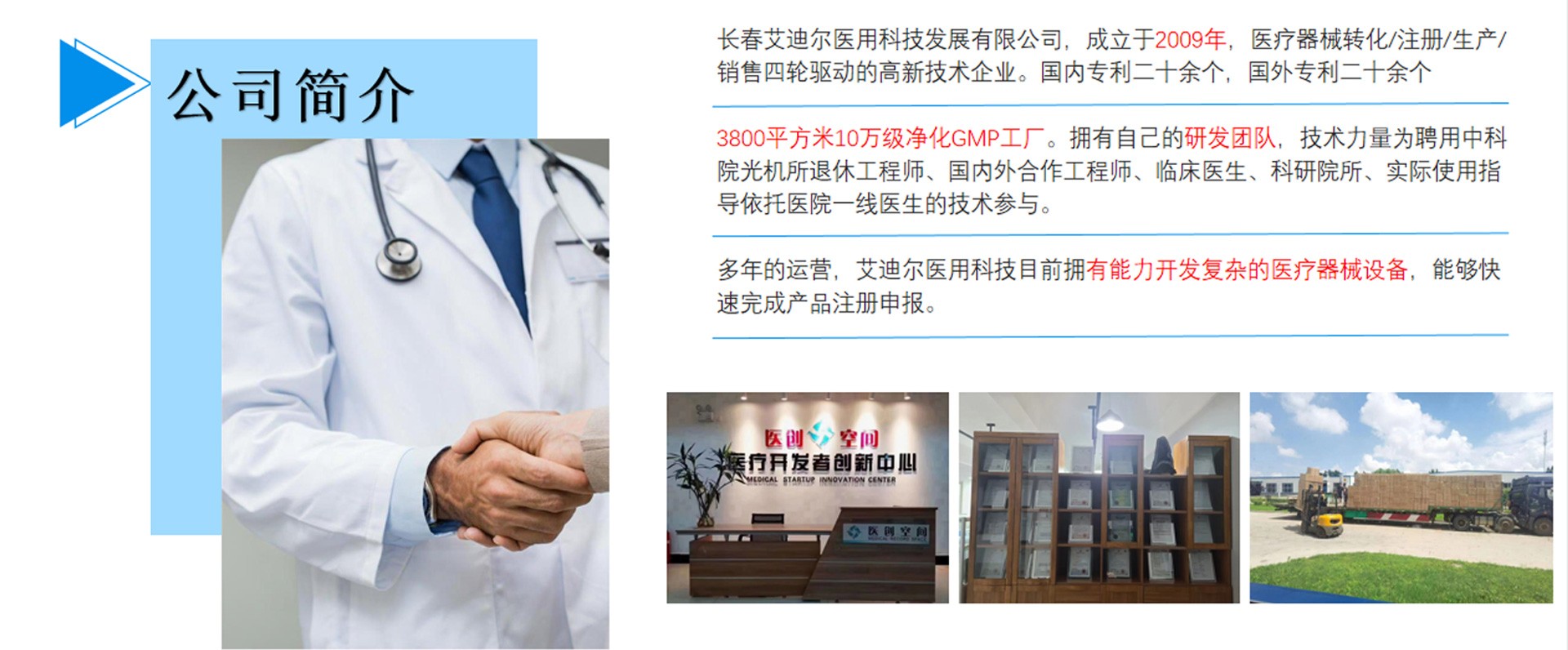 長春艾迪爾醫(yī)用科技發(fā)展有限公司為集產(chǎn)(自有工廠); 學(多所院校科研課題合作單位);研(研發(fā)成果轉(zhuǎn)化注冊)三位一體的高新技術(shù)企業(yè)。艾迪爾科技主要經(jīng)營范圍為一次性醫(yī)療器械耗材的開發(fā),專注于抗菌肽新材料的開發(fā)和研制,以“IN-58抗菌肽一類新藥及原料藥注冊、激光類治療儀”兩個核心優(yōu)勢技術(shù)為中心。公司擁有標準GMP車間及健全的質(zhì)量管理體系,擁有多個已上市和即將上市的產(chǎn)品,包括睡眠、泌尿、口腔、肝膽、消殺、婦科六大系列產(chǎn)品線。公司擁有核心專業(yè)技術(shù)報批團隊,承接國內(nèi)外醫(yī)療器械專項成果轉(zhuǎn)化,具備自主研發(fā)能力及MAH服務(wù)能力。